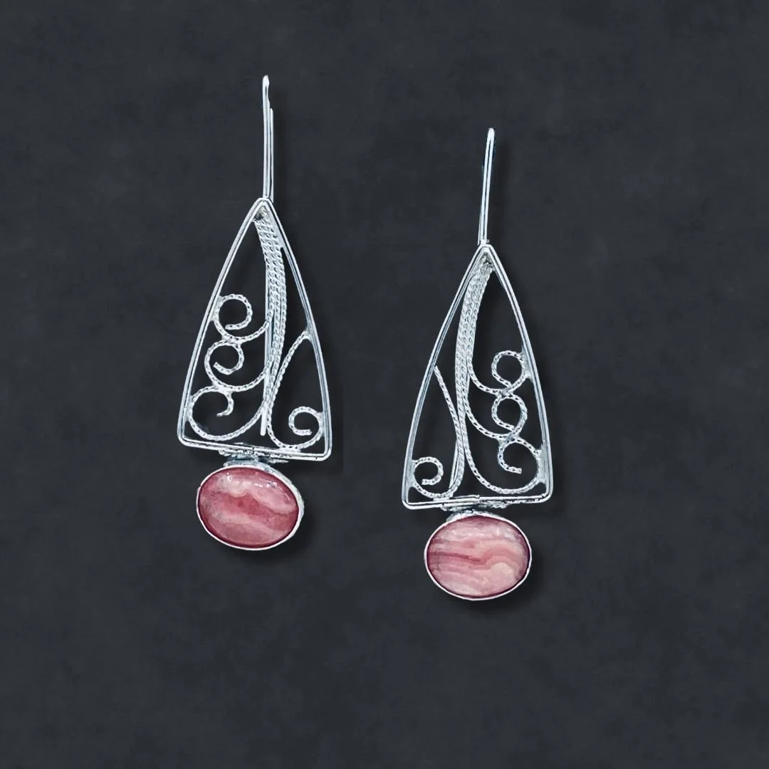 The Corinne Earrings are a stunning blend of elegance and artistry, featuring sterling silver filigree suspended from long, graceful wires. Below the intricate filigree, rhodochrosite cabochons in sterling silver bezels add a pop of soft pink color, enhancing the design’s sophistication. Measuring 5/8 inch by 1-3/4 inches, these handmade earrings are lightweight yet striking, perfect for any occasion.